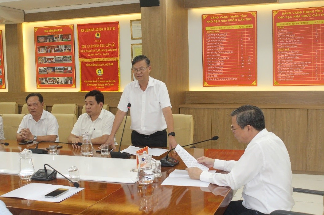 Ảnh: Đồng chí Lê Minh Công, Bí thư Đảng ủy, Giám đốc KBNN khu vực XIX báo cáo nhanh kết quả hoạt động của KBNN khu vực XIX tại buổi làm việc